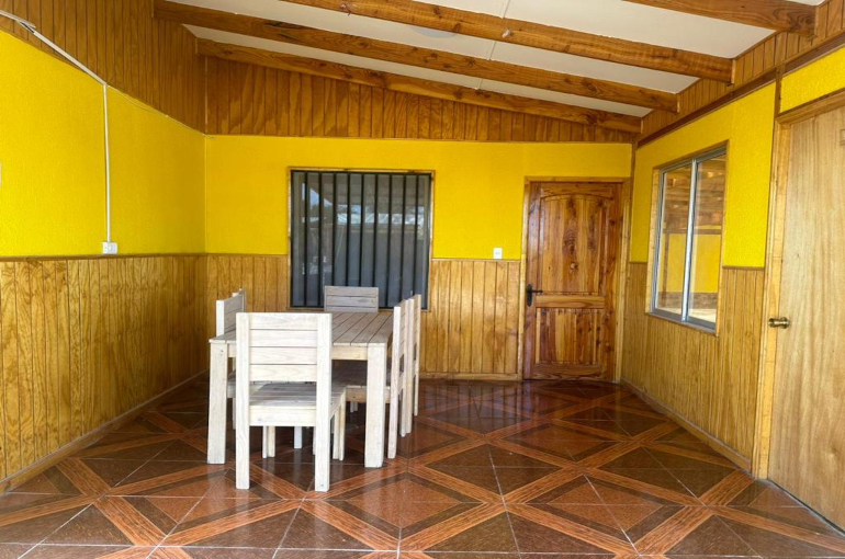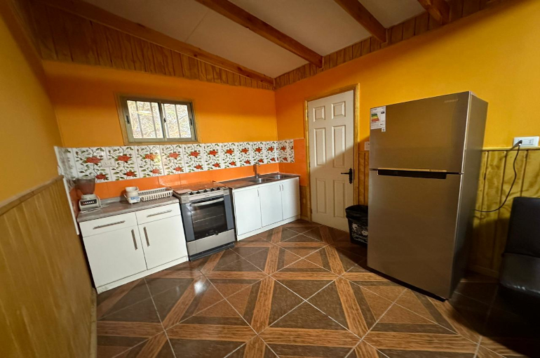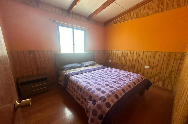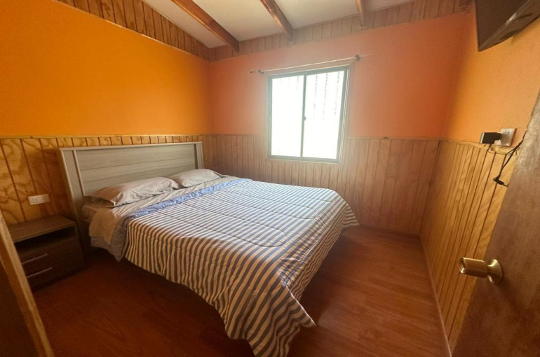 La cabaña para 4 personas cuenta con una cama matrimonial y litera, television satelital , cocina equipada con lavaplatos y refrigerador, baño y ducha con agua fría y caliente, terraza exterior, parrilla y estacionamiento techado a un costado de la cabaña.