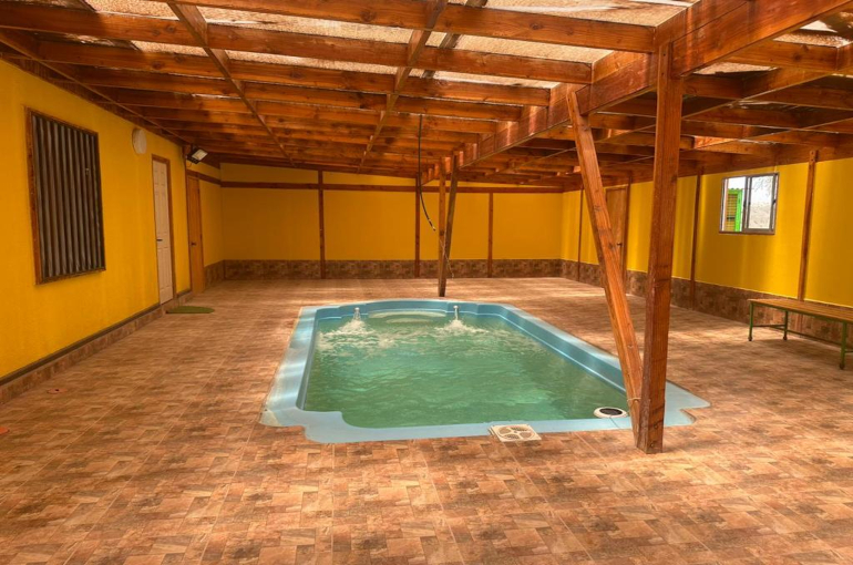 La cabaña para 8 personas cuenta con dos camas matrimoniales, un dormitorio con dos literas, televisión satelital, cocina equipada con lavaplatos y refrigerador, baño y ducha con agua fría y caliente, terraza exterior, parrilla, estacionamiento y pisicna privada con hambiente temperado.