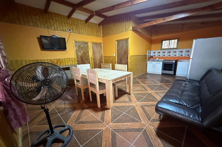 La cabaña para seis persons cuenta con una cama matrimonial y dos literas, television satelital, cocina equipada con lavaplatos y refrigerador, baño y ducha con agua fría y caliente, terraza exterior con bancas y comedor, parrilla y estacionamientos a un costado de la cabaña.