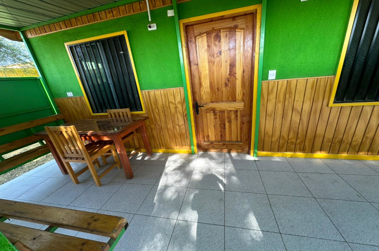 La cabaña para seis persons cuenta con una cama matrimonial y dos literas, television satelital, cocina equipada con lavaplatos y refrigerador, baño y ducha con agua fría y caliente, terraza exterior con bancas y comedor, parrilla y estacionamientos a un costado de la cabaña.